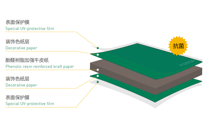 福爾卡·抗倍特板(纖維樹脂板)是由裝飾色紙含浸三聚氰胺樹脂,加上多層黑色或褐色牛皮紙含浸酚醛樹脂層疊后,再用鋼板經(jīng)由高溫(150° C)高壓(1430psi)的環(huán)境壓制而成,產(chǎn)品密度不低于 1450KG/m',厚度從 1.5mm 到 25mm 皆可制作。酚醛樹脂纖維板依其表面色紙層,可滿足多種花色選擇,單面或雙面的裝飾需求。